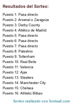Lista de participantes: Palestino, Derby County, Athletic Bilbao, Chelsea, Ajax, Real Betis, Manchester City, Tottenham, Steelers, Valencia, Atlético de Madrid, Pasa directo, Pasa directo, Pasa directo, Pasa directo, Arsenal o Zaragoza.