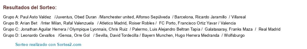 Lista de participantes: Roiser Robles / FC Porto, Alfonso Sepúlveda / Barcelona, Hugo Herrera Medranda / Wolfsburgo, Chris Ruiz / Palermo, Jonathan Aguilar Herrera / Olympique Lyonnais, Paul Asto Valdez /Juventus, Orre Gol / Sevilla, Arian Bet /Inter Milan, Luis Alejandro Beltran Tapia / Galatasaray, Leonardo Cevallos /Genoa, Franks Maza / Real Madrid, Obed Duran /Manchester united, Rafal Valenzuela / Atletico Madrid, Ricardo Jaramillo / Villareal, David Tordecilla / Bayern Munchen, Francisco Ortiz Yavar / Valencia.