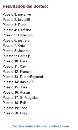Lista de participantes: Adolfo, Adrian, Jose, Ulldepop, Cuco, Dac, danigl87, Flamen, Evil, Sr Maguilus, RubenEspanol, Pyra, Ramillos, Rubo, Ruty, Santos, Xavi, Goss, lalyta89, Ayohe, mikanke, Cassius, Ciberfoxx, Comet, DDani, Ekry, jestrela, Ferris jr, Juanma, Kasper, albervil, Marc, Oriol, Pache, Tonim, Topo.