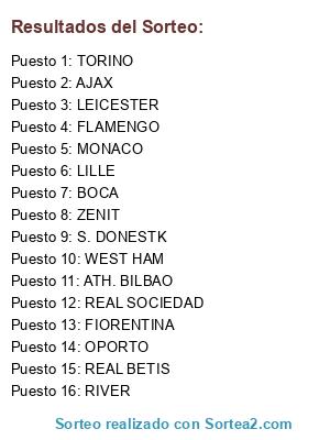 Lista de participantes: S. DONESTK, FLAMENGO, AJAX, REAL SOCIEDAD, TORINO, LILLE, LEICESTER, ATH. BILBAO, MONACO, REAL BETIS, FIORENTINA, RIVER, BOCA, OPORTO, WEST HAM, ZENIT.