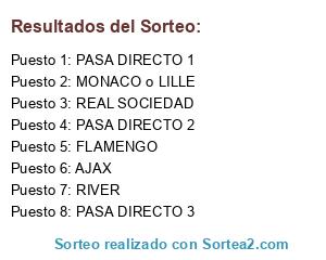 Lista de participantes: AJAX, FLAMENGO, MONACO o LILLE, PASA DIRECTO 1, PASA DIRECTO 3, REAL SOCIEDAD, PASA DIRECTO 2, RIVER.