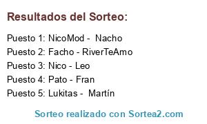 Lista de participantes: Fran, Leo, Lukitas, Martín, Nacho, NicoMod, Nico, Pato, RiverTeAmo, Facho.