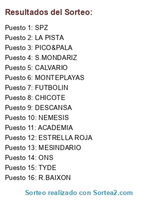 Lista de participantes: ONS, CHICOTE, SPZ, ESTRELLA ROJA, CALVARIO, S.MONDARIZ, MESINDARIO, FUTBOLIN, TYDE, R.BAIXON, ACADEMIA, MONTEPLAYAS, LA PISTA, NEMESIS, PICO&PALA, DESCANSA.
