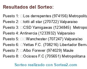 Lista de participantes: Antinercia (1233932) Valparaiso, ✧totti all star (270722) Valparaiso, ✦Albo Forever (974029) Maule, ☆Ociosos F.C (705651) Metropolitana , ✧Los derrepentes (974156) Metropolitana , ✦✦Wanchester (707247) Valparaíso, ✦Yettas F.C. (708216) Libertador Bernardo , ✧CSD Yamigawas (1234845) Metropolitana.