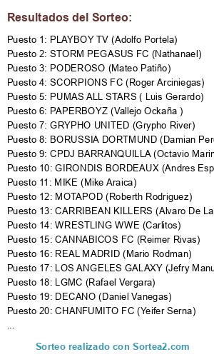 Lista de participantes: REAL MADRID (Mario Rodman), MOTAPOD (Roberth Rodriguez), CANNABICOS FC (Reimer Rivas), DECANO (Daniel Vanegas), GIRONDIS BORDEAUX (Andres Espitia), GRYPHO UNITED (Grypho River), SCORPIONS FC (Roger Arciniegas), PODEROSO (Mateo Patiño), LOS ANGELES GALAXY (Jefry Manuel), BAYERN MUNICH (Francisco Onell), PLAYBOY TV (Adolfo Portela), TOTTENHAM FC (Jose Carlo), CPDJ BARRANQUILLA (Octavio Marin), PASTORES FC (Pastor Esnaiver), BORUSSIA DORTMUND (Damian Perea), STORM PEGASUS FC (Nathanael), PINCHAMADRE FC (Luis Pineda ), SON SPORT FC (Son Ramirez), CD ALIANZA PLATANERA (Stiven Ale Licona), PUMAS ALL STARS ( Luis Gerardo), CHANFUMITO FC (Yeifer Serna), LA BANANA MECANICA (Jonathan David), DIABLOS ROJOS FC (Jose Ronaldo Vidal), CALATRAVA FC (Camilo Pes), MIKE (Mike Araica), CARRIBEAN KILLERS (Alvaro De La Rosa), A.S. OUTLINING (David Cedeño), THE REBIRDTH OF FENIX (Sergio Ruiz), PAPERBOYZ (Vallejo Ockaña ), LGMC (Rafael Vergara), CHIVAS (Eros Juarez), WRESTLING WWE (Carlitos).