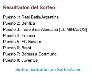 Lista de participantes: Juventus, Real Betis/Argentina, Brasil, FC Bayern, Borussia Dortmund, Benfica, Francia, Fiorentina-Alemania [ELIMINADOS].