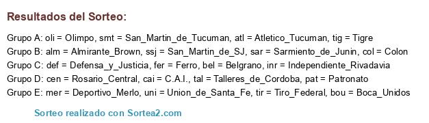Lista de participantes: alm = Almirante_Brown, atl = Atletico_Tucuman, bel = Belgrano, bou = Boca_Unidos, cai = C.A.I., col = Colon, def = Defensa_y_Justicia, mer = Deportivo_Merlo, fer = Ferro, inr = Independiente_Rivadavia, oli = Olimpo, pat = Patronato, cen = Rosario_Central, ssj = San_Martin_de_SJ, smt = San_Martin_de_Tucuman, sar = Sarmiento_de_Junin, tal = Talleres_de_Cordoba, tig = Tigre, tir = Tiro_Federal, uni = Union_de_Santa_Fe.