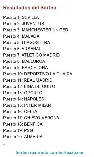 Lista de participantes: REAL MADRID, MALLORCA, BARCELONA, DEPORTIVO LA GUAIRA, ALMERIA, BENFICA, MALAGA, OPORTO, JUVENTUS, CHIEVO VERONA, PSG, CELTA, ATLETICO MADRID, MANCHESTER UNITED, PARMA, TORINO, INTER MILAN, GIRONA, ARSENAL, SEVILLA, LIGA DE QUITO, LLAGOSTERA, BETIS, NAPOLES.