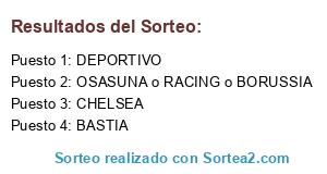 Lista de participantes: CHELSEA, DEPORTIVO, BASTIA, OSASUNA o RACING o BORUSSIA.