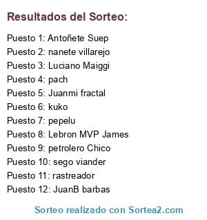 Lista de participantes: Juanmi fractal, Luciano Maiggi, Antoñete Suep, pach, petrolero Chico, rastreador, JuanB barbas, nanete villarejo, sego viander, Lebron MVP James, kuko, pepelu.