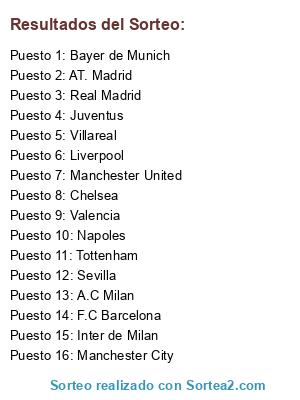 Lista de participantes: A.C Milan, AT. Madrid, Bayer de Munich, Chelsea, F.C Barcelona, Inter de Milan, Juventus, Liverpool, Manchester City, Manchester United, Napoles, Real Madrid, Sevilla, Tottenham, Valencia, Villareal.