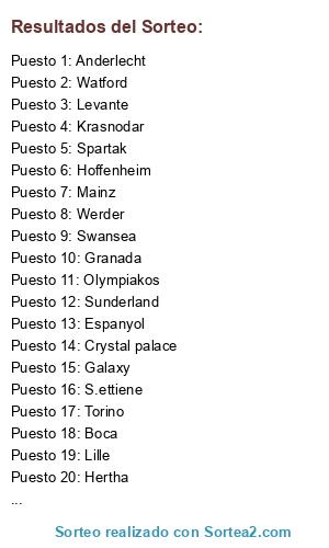 Lista de participantes: Boca, Lille, Mainz, Hoffenheim, Ajax, Hertha, S.ettiene, Sunderland, Levante, Olympiakos, Krasnodar, Malaga, Espanyol, Werder, Anderlecht, Braga, Spartak, Torino, Watford, Swansea, Galaxy, Crystal palace, Granada, West ham.
