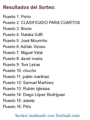 Lista de participantes: José Mourinho, alesito, Adrián Vizoso, Toni Leiras, chucho, david riveira, Miguel Vidal, Diego López Rodríguez, Natalia GdR, Samuel Martínez, Rubén Iglesias, Bruno, pablo martinez, Pitís, Porto, CLASIFICADO PARA CUARTOS.