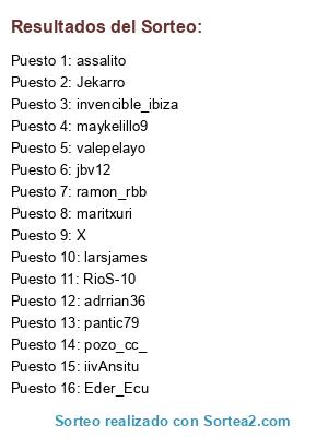 Lista de participantes: ramon_rbb, Jekarro, maritxuri, adrrian36, pantic79, maykelillo9, larsjames, invencible_ibiza, RioS-10, pozo_cc_, iivAnsitu, valepelayo, Eder_Ecu, assalito, jbv12, X.