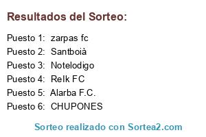 Lista de participantes: zarpas fc , ReIk FC , Santboià , CHUPONES , Alarba F.C. , Notelodigo.