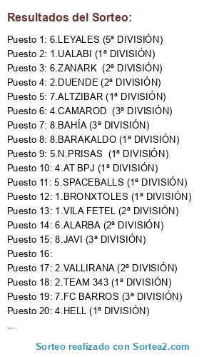 Lista de participantes: 1.UALABI (1ª DIVISIÓN), 2.VALLIRANA (2ª DIVISIÓN), 3.NOTELODIGO (1ª DIVISIÓN), 4.HELL (1ª DIVISIÓN), 5.SPACEBALLS (1ª DIVISIÓN), 6.ALARBA (2ª DIVISIÓN), 7.ALTZIBAR (1ª DIVISIÓN), 8.BARAKALDO (1ª DIVISIÓN), 1.BRONXTOLES (1ª DIVISIÓN), 2.TEAM 343 (1ª DIVISIÓN), 3.DANIANARKOS (2ª DIVISIÓN), 4.CAMAROD (3ª DIVISIÓN), 5.N.PRISAS (1ª DIVISIÓN), 6.ZANARK (2ª DIVISIÓN), 7.MIKETOLLIN (1ª DIVISIÓN), 8.JAVI (3ª DIVISIÓN), 1.VILA FETEL (2ª DIVISIÓN), 2.DUENDE (2ª DIVISIÓN), 3.TACHITO (2ª DIVISIÓN), 4.AT BPJ (1ª DIVISIÓN), 5.MALAKH (3ª DIVISIÓN), 6.LEYALES (5ª DIVISIÓN), 7.FC BARROS (3ª DIVISIÓN), 8.BAHÍA (3ª DIVISIÓN).