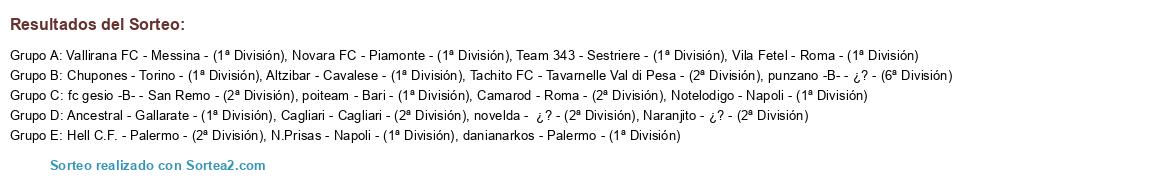 Lista de participantes: Vila Fetel - Roma - (1ª División), Altzibar - Cavalese - (1ª División), Notelodigo - Napoli - (1ª División), danianarkos - Palermo - (1ª División), Vallirana FC - Messina - (1ª División), Cagliari - Cagliari - (2ª División), N.Prisas - Napoli - (1ª División), Novara FC - Piamonte - (1ª División), Ancestral - Gallarate - (1ª División), fc gesio -B- - San Remo - (2ª División), Hell C.F. - Palermo - (2ª División), punzano -B- - ¿? - (6ª División), Naranjito - ¿? - (2ª División), Camarod - Roma - (2ª División), poiteam - Bari - (1ª División), novelda - ¿? - (2ª División), Team 343 - Sestriere - (1ª División), Tachito FC - Tavarnelle Val di Pesa - (2ª División), Chupones - Torino - (1ª División).
