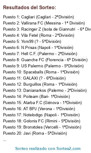 Lista de participantes: N.Prisas (Napoli - 1ªDivisión), Miketollin (Cagliari- 1ªDivisión), Team 343 (Sestriere - 1ªDivisión), AT BPJ (Verona - 1ªDivisión), Barakaldo (Milan - 1ªDivisión), CHUPONES (Torino - 1ªDivisión), Maiden FC (Milan - 1ªDivisión), Camarod (Torino - 5ª División), Bahia CF (Ercolano - 5ª División), Malakh (Rimini - 5ª División), Javi (Roma - 5ªDivisión), Bronxtoles (Vercelli - 1ªDivisión), Poiteam (Bari- 1ªDivisión), Deltiron (Siracusa - 4ªDivisión), Yorx99 (? - 5ªDivisión), Altzibar (Domodossola - 3ªDivisión), Danianarkos (Palermo - 2ªDivisión), Guanche FC (Florencia - 6ª División), Vila Fetel (Roma - 2ªDivisión), Notelodigo (Napoli - 1ªDivisión), Hell C.F. (Palermo - 2ªDivisión), Spaceballs (Roma - 1ªDivisión), GALAXI (? - 6ªDivisión), Duende FC (Milan - 2ªDivisión), Cagliari (Cagliari - 2ªDivisión), Leyales FC (Palermo - 6ª División), US Palermo (Palermo - 5ªDivisión), Racinger Z (Isola de Giannutri - 6ª División), Tachito FC (Tavarnelle Val Di Pesa - 2ªDivisión), Ualabi (Sicilia - 1ªDivisión), F.C Barros (Messina - 2ªDivisión), Burguillos (Roma - 1ªDivisión), Campeones FC (Corleone - 4ªDivisión), Alarba F.C (Génova - 1ªDivisión), Vallirana FC (Messina - 1ª División), Golonis FC (Rimini - 5ªDivisión).