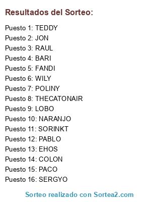 Lista de participantes: WILY, COLON, SERGYO, BARI, JON, LOBO, POLINY, NARANJO, PACO, RAUL, EHOS, FANDI, PABLO, SORINKT, TEDDY, THECATONAIR.