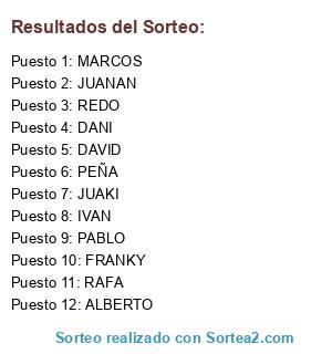 Lista de participantes: PABLO, JUAKI, RAFA, REDO, MARCOS, ALBERTO, JUANAN, PEÑA, IVAN, DANI, DAVID, FRANKY.