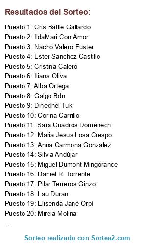 Lista de participantes: Adela Baena Correa , Adela Etc , Aida Delgado , Aida Hernandez , Alba Bermudez Jimenez , Alba Bossoms Mesa , Alba Ortega , Albert Ribas Zamarreño , Alejandra Paruzzolo , Alejandro Rebollo Sánchez , Alexandros Lioumbis , Alicia Cabrera Vila , Alicia Reyes Español , Almudena Felipe , Amèlia Llauradí Rubinat , Ana Barrera Manzanera , Ana Belén Lopezosa , Ana Biarnés , Ana Ortega Granero , Anastasia Solomina , Angelina Llobera , Anita Caracol , Anna Carmona Gonzalez , Anna MJ , Anna Rodriguez Tarrida , Antoni Poch Comas , Antonio Claret Dos Santos , Antonio Pizarro Miaja , Ascensión M Macizo , Ateneanike Mona Teki , Azucena Caraballo , Bàrbara Ramajo Garcia , Bea GaGo , Bea Olgu , Belén Montero Delgado , Bet Alonso Muria , Blanca Gonzalez Castellon , Boniblue Elias , Carlos Mario Olaya , Carmen Fajardo , Carmen Muñoz Ballester , Carmen Osea , Carolina Aranda Vallejo , Carolina Cagua Murillo , Corina Carrillo , Cris Batlle Gallardo , Cris Planella , Cristi Burrow , Cristian García Garijo , Cristina Alba , Cristina Banchs Ruiz , Cristina Calero , Cristina Canals , Cristina Cervantes , Cristina Gllrd , Cristina Jaldón , Cristina Martínez García , Cristina Moreno , Cristina Osuna , Cristina Reyes , Daniel R. Torrente , David Ct , Davidson Cañaveral , Diana Juarros Carrera , Diani PrietoRo , Dinedhel Tuk , Dolors Martinez , Domingo Garcia Rodriguez , Edmundo Gantier , Elisabet Gonzalez Estevez , Elisabet Lara , Elisabeth Dionisio , Elisenda Jané Orpí , Encarni Portugues Pastor , Enrique de la Peña , Estel Constante , Ester Eri Rufat , Ester Sanchez Castillo , Esther De Juana López , Esther Libertad Sivianes Sánchez , Esther Sanchez Ibañez , Esther Suárez Marin , Eva Casamian Galindo , Eva Cruz , Eva Linan , Eva Sp , Fabián Beltrán Gómez , Frederique Louis , Galgo Bdn , Georgina Cabrera , Gisela Cabré , Helena Coloma Díez , Ignacio Rios Martinez , IldaMari Con Amor , Iliana Oliva , Inés Escribà , Ingrid Herrero , Inma Gomez , Inma Reyes Martínez , Irene González , Isabel Bujalance , Isabel Sánchez Fuentes , JA Arriva Lestiu , Jaume Ag , Javier Diaz , Javier Lobo Sánchez , Jeshu Pavez , Jessica Garcia Cabezuelo , Jessica Herrera , Jime La Del Barrio , Joanna Kamaso , Jordi Gutierrez , Jorge Monjardin Sanchez , Jose Miguel Garcia Herrer , Josep Ollé , Josep Palà Puy , Juan Alba , Juan González , Juanjo Tejado Balsera , Jud Major , Kelly Rabionet , Laia Font Valentín , Laia Weisz , Lau Duran , Laura Cristina Naranjo Muñoz , Laura Roc , Lluís Danús Amengual , Loli Santamaria , Loreto Vañó Bataller , Lucía Hepburn López , Lucia Soriano Jimenez , Lydia Tuset , M Carme Garcia Martinez , Magda Urgelés Borràs , Maite Badia , Mar Bretones , Mar CA , Mar Ligero , Marc Domenech Pedrola , Marga Amezcua , Marga Mayans , Mari Carmen Cumplido Castillo , Mari Loli , Maria Cristina Salgado , Maria Elena Batista , Maria Jesus Losa Crespo , María José Simón , Maria Matute , Maria Navajas Castro , Marian Fuente , Marieta Del Ull Viu , Marina Torrellas Arnedo , Maritza Estévez González , Marta Abad Puig , Marta Buj , Marta Frigolé Vivas , Marta Muñoz Azuara , Marta New Houses , Marta SC , Marta Sospedra Martin , May Ventura , Mayra Araque Ochoa , Mayu Cordero Mariño , Mc Jamma , Melania Santamaria , Merce Blanch , Meri Martorell Mascaró , Meritxell Escandell , Miguel Dumont Mingorance , Miguel Garcia Fernandez , Mireia Catot , Mireia Gar , Mireia Molina , Miriam Maria , Mònica Jané Cardo , Mónica Negro Rodríguez , Mónica Pardo , Montse Navarro Lizcano , Montse Vázquez Hernández , Nacho Valero Fuster , Naomi AV , Neus Amat Amat , Neus Molina Puig , Nodimo Diaz , Noelia Tallón , Noemi Herrera , Noemí Pujol , Patricia Grove Bermejo , Patricia Muro , Patricia Nadal , Patricia Segarra , Pau Molet , Paula Gómez De Cadiñanos , Pilar Melcón , Pilar Pina Berges , Pilar Terreros Ginzo , Rafa Twose , Raquel Freire , Raquel Martínez Gutiérrex , Rebeca Perez Correderas , Robert Torné Batista , Roberto Crespo Sardá , Rosa María Rebollal , Rosa Vidal Bassa , Rosaanna Nieto , Roser Inmbncxs , Rossy Roig Losantos , Ruben Martinez Fresneda , Rut Díez , Rut Martínez Miras , Sandra Gonzalez , Santos Valenciano Fernandez , Sara Cuadros Domènech , Sara López López , Sara Rosich Mateos , Sara Rubio Morales , Silvia Andújar , Silvia Lopez Alonso , Silvia Moles Piquer , Sílvia Riera , Sofia Lain , Soledad Gómez , Sonia Iturrate , Soraya Peláez Herrera , Sun Suna , Susana Gulo , Susana Yo , Susi Sánchez , Susi Vega Moreno , Tania Nicolás , Tonyi Piñero , Vanesa Ambròs , Vanesa MA , Vanessa Lancharro , Vanessa Romero , Verónica Ortega , Virginia Mi Ma , Yolanda Caballero Jimenez , Yolanda Pardo Hernandez , Μαρια Ξεσυς Σανχηεζ Μαρτινεζ.