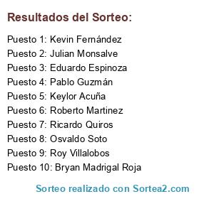 Lista de participantes: Osvaldo Soto, Bryan Madrigal Roja, Pablo Guzmán, Keylor Acuña, Julian Monsalve, Roy Villalobos, Kevin Fernández, Eduardo Espinoza, Roberto Martinez, Ricardo Quiros.