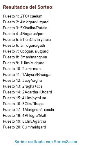Lista de participantes: 1Ulm/Midgard, 4Ulm/pythium, 3aby/ragha, 3man/marignon, 3midgard/gath, 4Midgard/utgard, 2ulm+man, 2Agartha+Utgard, 2ragha+ctis, 6ulm/midgard, 1Abysia/Rhaega, 3ulm/phlegra, 6phlegra/agartha, 4Phlegra/Gath, 4Bogarus/pan, 1C'tis/Agartha, 6bogarus/utgard.