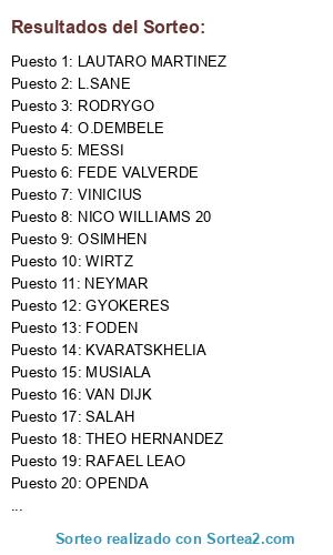Lista de participantes: MBAPPE, VINICIUS, HAALAND, BELLINGHAM, SALAH, MESSI, RAFAEL LEAO, NEYMAR, MUSIALA, H.SON 10, O.DEMBELE, GRIEZMANN, FODEN, RODRYGO, LUIS DIAZ, FEDE VALVERDE, LAUTARO MARTINEZ, L.SANE, OSIMHEN, NICO WILLIAMS 20, RAPHINHA, GYOKERES, THEO HERNANDEZ, DE BRUYNE, VAN DIJK, OPENDA, WIRTZ, KVARATSKHELIA.