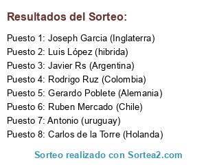 Lista de participantes: Carlos de la Torre (Holanda), Rodrigo Ruz (Colombia), Ruben Mercado (Chile), Antonio (uruguay), Joseph Garcia (Inglaterra), Javier Rs (Argentina), Gerardo Poblete (Alemania), Luis López (hibrida).