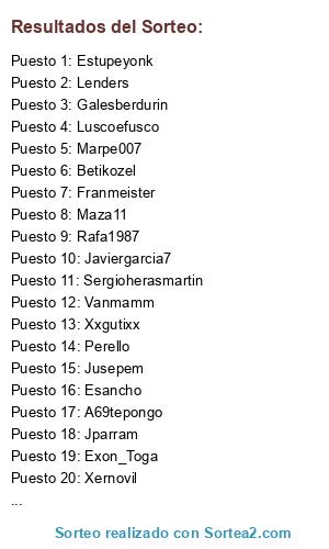 Lista de participantes: Vanmamm, Marpe007, Maza11, Perello, Xernovil, Chisnieto, Rvtys3, Andoni, Xxgutixx, Javiergarcia7, Juanma_10, Zenitramm, Luscoefusco, Tarzandelpro, Exon_Toga, Zeus_Algol, Lionheart, Sergioherasmartin, Siboga, Jusepem, Estupeyonk, Seutito, Lenders, Gorri7, Davies19951995, El_Sucre, A69tepongo, Esancho, Jparram, Gabe, Betikozel, Franmeister, Galesberdurin, Rafa1987, Zanarkanz, Saxoman.