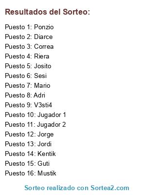 Lista de participantes: V3sti4, Guti, Ponzio, Sesi, Mario, Adri, Kentik, Jordi, Jorge, Riera, Mustik, Jugador 1, Josito, Correa, Diarce, Jugador 2.