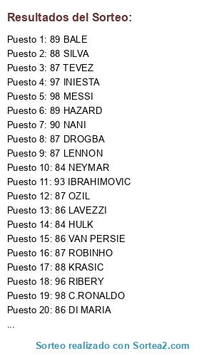 Lista de participantes: 98 MESSI, 98 C.RONALDO, 97 INIESTA, 96 RIBERY, 93 IBRAHIMOVIC, 93 ROBBEN, 90 AGUERO, 90 ROONEY, 90 NANI, 89 RONALDINHO, 89 HAZARD, 89 MODRIC, 88 KRASIC, 88 SILVA, 87 DROGBA, 87 LENNON, 87 ROBINHO, 87 TEVEZ, 87 OZIL, 87 S.CAZORLA, 86 LAVEZZI, 86 VAN PERSIE, 86 DI MARIA, 89 BALE, 82 PATO, 85 ALEXIS SANCHEZ, 84 HULK, 84 NEYMAR.