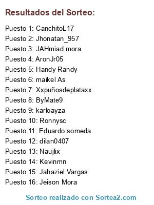 Lista de participantes: Naujlix, CanchitoL17, ByMate9, Xxpuñosdeplataxx, karloayza, dilan0407, Eduardo someda, JAHmiad mora, Jeison Mora, Jhonatan_957, Kevinmn, maikel As, Ronnysc, Handy Randy, AronJr05, Jahaziel Vargas.