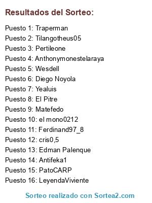 Lista de participantes: Diego Noyola, PatoCARP, El Pitre, Traperman, LeyendaViviente, el mono0212, Yealuis, Pertileone, Edman Palenque, Tilangotheus05, Wesdell, Antifeka1, Ferdinand97_8, Matefedo, cris0,5, Anthonymonestelaraya.