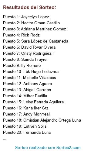 Lista de participantes: Patricia Eugenia Hernandez Moncayo, Diego Rivas, Ariaz Ramirez, Juan Fco Gomez Campos, Adriana Martínez Gomez, Michelle Villalobos, WK J Jesus, Victoria Mayela Castillo Hernandez, Ramón Ortiz, Bity Teresa Ayala, Fanny Quiñones, Sainda Frayre, Giio Maciel, Benny Lopez Oz, Herrada Hernandez Jose, Anyelina Jara, Anna Martell, Sara López de Castañeda, Lavadoras Alberto Anguiano, Abigail Carreon, Mfher Padilla, Miguel Angel Flores Nava, Ivan Aguilera, Lbk Hugo Ledezma, Lupita Bejarano Castro, David Tovar Olvera, Ysaac Ramires Venegas, Fernanda Luna, Isabel Casas, Leisy Estrada Aguilera, Hector Oman Castillo, Karla Iker Gtz, Diana Valdez, Meño Compean Ramirez, Sarahí Lara, Eduardo Sanchez, Anthony Aguero, Carlos Gonzalez, Vasni Barker, Cin M Ríos, Kareen Lunna, Yazmin Guadalupe Gomez Ramirez, Janeth Alejandra Martinez Rodriguez, Byron Carreon, Rick Rodz, Crhistian Alejandro Ortega Luna, Mayra Alvarado, Osvaldo Ochoa Encina, Mafer Rivas, Claudia Yovanna García, Oscar Jesús García Aguilar, Tita Barrios, Eduardo Robles, Gina Colmenero, Erika Núñez Vazquez, Ily Romero, Edgar Sustaita, Aby Valenzuela, Cristy Rodríguez F, Josshua Monccayoo V, Alexitta Bonita, Cristy Macias Morales, A.j. Gallegoos, Wendy Bravo, Catrx Vaquera, Joycelyn Lopez, Alejandra Soria, Laura Ayala de Ortiz, Jose Facio, Estiven Solis, Lysaa D Laa Toorree Mttzz, Luis Antonio Chavez Muñoz, Estefaniaa Saucedoo Ibarraa, Janeth Lopez, Daniel Tsaenz, Andy Monrreal, .