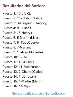 Lista de participantes: -JC, -Karan, -Gargano, -Martín (Lider), -Leo, -Mariano, -FedeCuervo, -Julián C, - Gabo, - Velsharoon, -Julian Y, -Alan Morientes, -Mijorro, -Henryk.