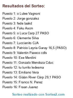 Lista de participantes: Patricio Leyria Garay 16,5 (PASO), o Lulee Vagnoni, Giään River Cärp 29,1 PASO, o Luca Carp 27 PASO, Luccianito CJA, Jorge gonzalez, Fraan Juarez, Exe Merdini, Franco N. Perez, Emiliano Vera, Clemente Silva, Faku Ascm, Gonzalo Mendoza Cduc, Valentin Paxeco cdls, tu turrito ledesma, fede laakd.