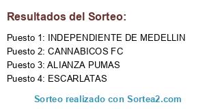 Lista de participantes: INDEPENDIENTE DE MEDELLIN, ESCARLATAS, CANNABICOS FC, ALIANZA PUMAS.