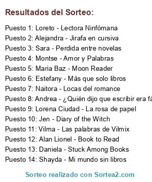 Lista de participantes: Vilma - Las palabras de Vilmix, Alejandra - Jirafa en cursiva, Montse - Amor y Palabras, Alan Lionel - Book to Read, Lorena Ciudad - La rosa de papel, Loreto - Lectora Ninfómana, Jen - Diary of the Witch, Andrea - ¿Quién dijo que escribir era fácil?, Estefany - Más que solo libros, Daniela - Stuck Among Books, Sara - Perdida entre novelas, Naitora - Locas del romance, Maria Baz - Moon Reader, Shayda - Mi mundo sin libros.
