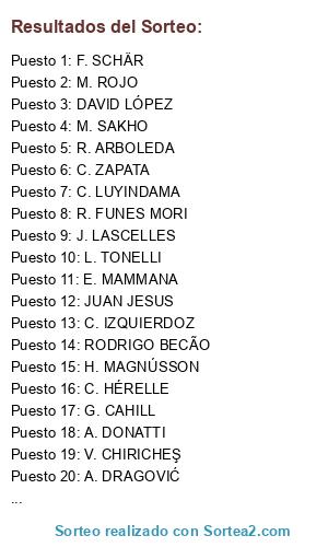 Lista de participantes: R. FUNES MORI, N. VIERGEVER, RODRIGO BECÃO, S. KRIVTSOV, HILTON, C. IZQUIERDOZ, S. DUFFY, A. DONATTI, C. HÉRELLE, GUSTAVO H., O. MURILLO, M. ŠKRTEL, L. DUNK, B. STAMBOULI, J. LASCELLES, C. ZAPATA, C. LUYINDAMA, B. ENGELS, N. MILENKOVIĆ, E. MAMMANA, L. MARTÍNEZ, GIL, LUÍS NETO, F. SCHÄR, RAFAEL TOLÓI, M. SAKHO, JUANPE, DAVID LÓPEZ, V. CHIRICHEŞ, VÍCTOR RUÍZ, ÁLVARO GONZÁLEZ, JUAN JESUS, L. MAGALLÁN, H. MAGNÚSSON, G. MANCINI, A. DRAGOVIĆ, S. GIGOT, L. TONELLI, G. CAHILL, B. MECHELE, N. ARAÚJO, LLORENTE, R. ARBOLEDA, M. ROJO, D. ĆALETA-CAR.