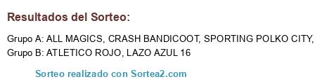 Lista de participantes: SPORTING POLKO CITY, ATLETICO ROJO, TOM CITY, CRASH BANDICOOT, LAZO AZUL 16, ALL MAGICS.