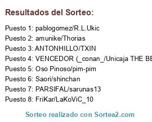 Lista de participantes: Saori/shinchan, Oso Pinoso/pim-pim, VENCEDOR (_conan_/Unicaja THE BEST vs aitor55/ismogo), ANTONHILLO/TXIN, FriKar/LaKoViC_10, PARSIFAL/sarunas13, pablogomez/R.L.Ukic, amunike/Thorias.