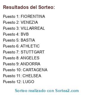 Lista de participantes: BVB, CARTAGENA, STUTTGART, ANDORRA, FIORENTINA, VILLARREAL, BASTIA, VENEZIA, ATHLETIC, ANGELES, LUGO, CHELSEA.