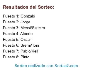Lista de participantes: Óscar, Gonzalo, Jorge, Pinto, Alberto, Bremi/Toni, Pablo/Keil, Messi/Salteiro.
