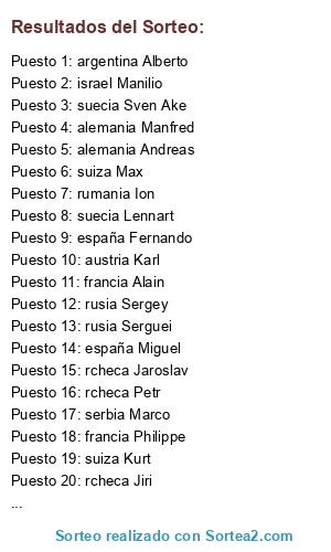 Lista de participantes: serbia Marco , rcheca Jiri , españa Alfonso , argentina Alberto, argentina Manuel , suecia Lennart , francia Philippe, serbia Ivan , rcheca Petr , rusia Mikhail , usa Alexander , alemania Manfred , alemania Andreas , austria Karl, españa Fernando, suiza Kurt, serbia Dragan , rumania Constantin , rcheca Miroslav , holanda Joris, israel Manilio, austria Thomas , suiza Max, francia Alain, rusia Sergey , rusia Serguei, suecia Sven Ake, chile Bastian, españa Miguel , alemania Jurgen , croacia Bozo , españa Javier , chile Vicente, rumania Ion, rcheca Jaroslav, usa John.