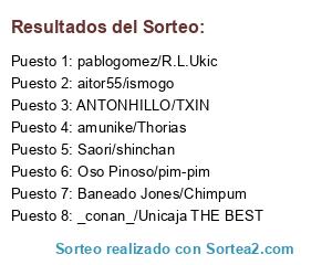 Lista de participantes: ANTONHILLO/TXIN, Oso Pinoso/pim-pim, amunike/Thorias, Baneado Jones/Chimpum, pablogomez/R.L.Ukic, _conan_/Unicaja THE BEST, aitor55/ismogo, Saori/shinchan.