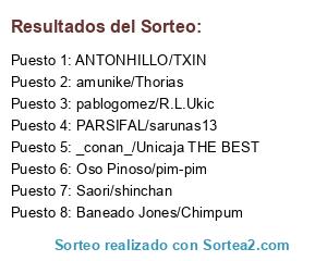 Lista de participantes: ANTONHILLO/TXIN, Oso Pinoso/pim-pim, amunike/Thorias, Baneado Jones/Chimpum, pablogomez/R.L.Ukic, _conan_/Unicaja THE BEST, Saori/shinchan, PARSIFAL/sarunas13.