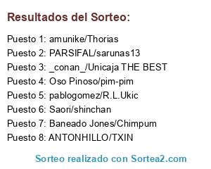 Lista de participantes: ANTONHILLO/TXIN, Saori/shinchan, _conan_/Unicaja THE BEST, Oso Pinoso/pim-pim, amunike/Thorias, pablogomez/R.L.Ukic, PARSIFAL/sarunas13, Baneado Jones/Chimpum.