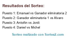 Lista de participantes: Antoñin vs Jordi, Emanuel vs Ganador eliminatoria 2, Daniel vs Michel, Ganador eliminatoria 1 vs Alvaro.