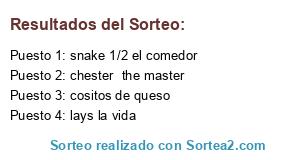 Lista de participantes: cositos de queso, chester the master, snake 1/2 el comedor, lays la vida.